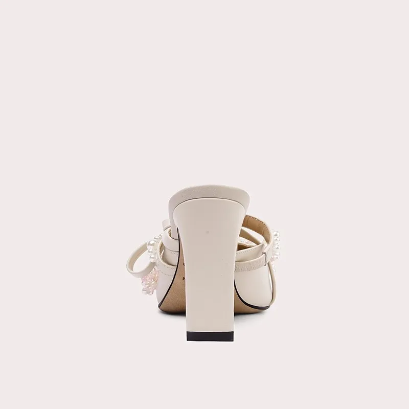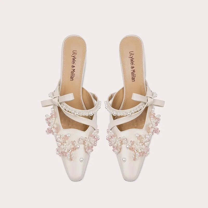 Women's Elegant Pearl White Wedding Shoes High Heels Bridal Square Heel Wholesale Closed Toe Plus Size Summer